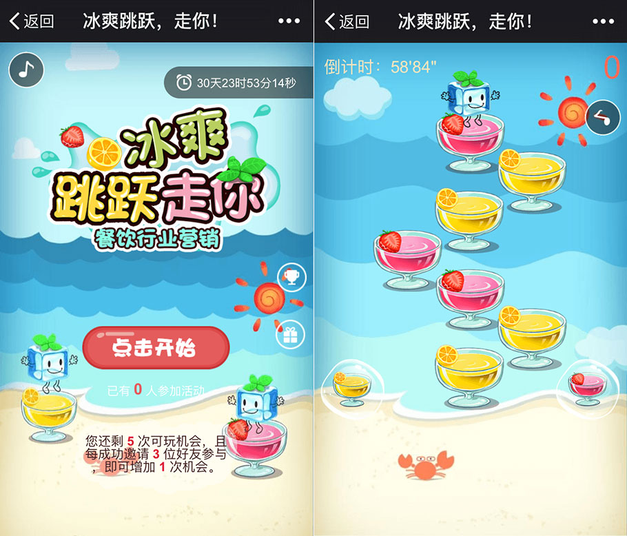 《冰爽跳躍,走你!》,可用在甜品店、奶茶店、鮮榨果汁等其它餐飲行業(yè),以及零售店、商城等諸多行業(yè)的季節(jié)性營銷(夏季、暑期)。通過游戲的趣味互動來提升粉絲的活躍度,