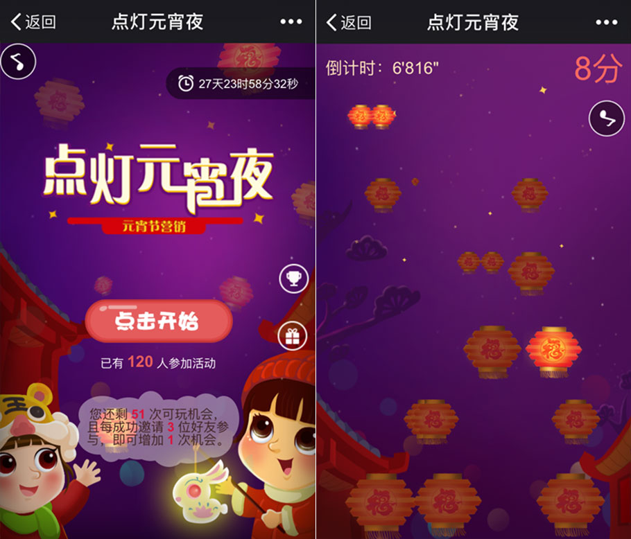 元宵節(jié)主題游戲,可用于多行業(yè),比如商城、餐飲、房產(chǎn)、汽車、景點、服務(wù)業(yè)等等。利用游戲策劃“玩游戲免費送湯圓”、“玩游戲贏電影票”、“玩游戲送賞燈門票”等等諸如此類的活動,都可以激發(fā)粉絲的參與,實現(xiàn)粉絲轉(zhuǎn)化,達(dá)到營銷目的。