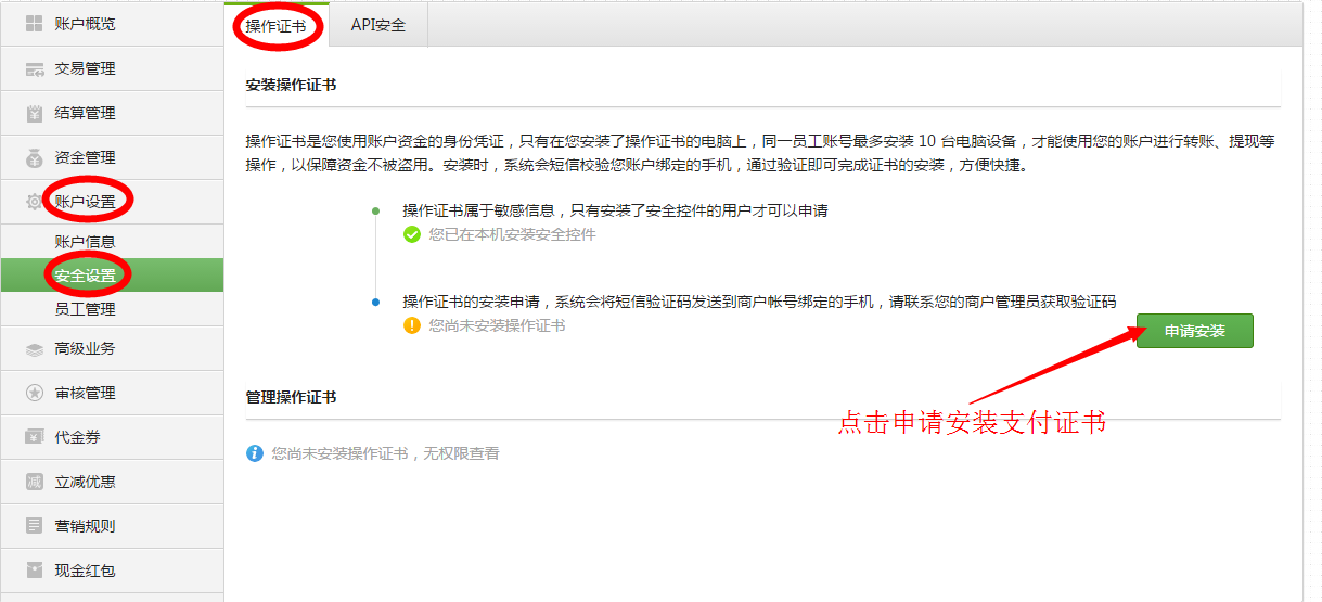 登陸成功之后,在【賬戶設(shè)置】中找到【安全設(shè)置】【操作證書】,如下: