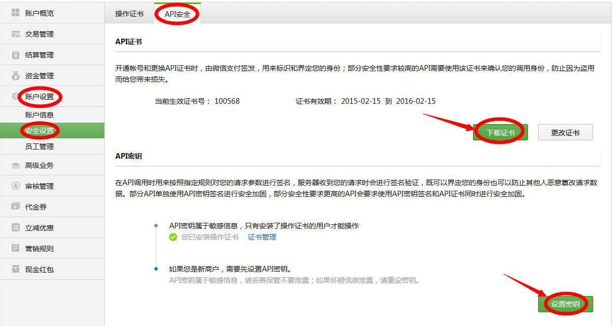 證書下載與密鑰設(shè)置,在【賬戶設(shè)置】中找到【安全設(shè)置】【API安全】進(jìn)行設(shè)置,如下: