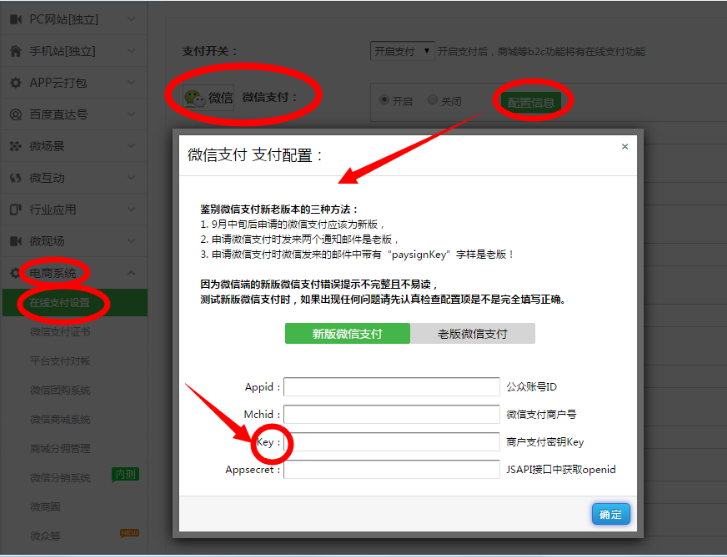 注:這里設(shè)置的密鑰填寫在系統(tǒng)后臺中【電商系統(tǒng)】---【在線支付設(shè)置】----【微信支付】配置中的key,如下: