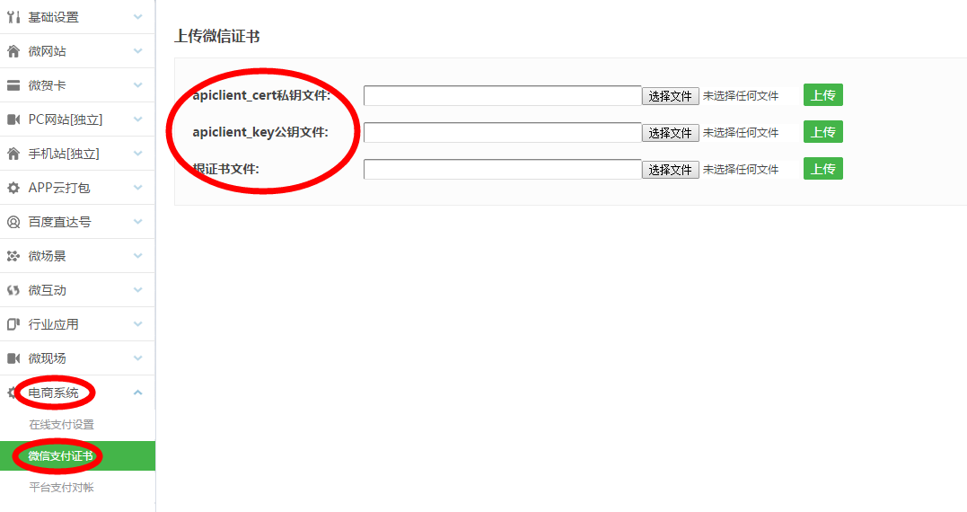 在系統(tǒng)后臺的【電商系統(tǒng)】【微信支付證書】中上傳,如下: