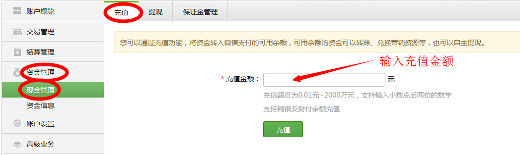 在微信支付平臺,【資金管理】【現(xiàn)金管理】進(jìn)行充值,如下: