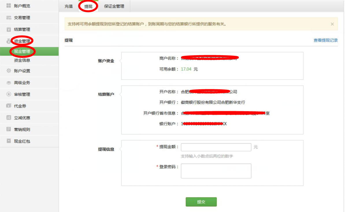 提現(xiàn):指設(shè)置活動(dòng)時(shí)紅包總金額小于充值時(shí)的金額時(shí),商家可以把剩下的金額提到登記賬戶中。