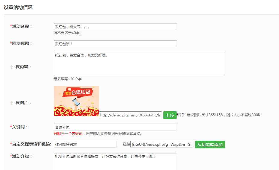 回復(fù)標(biāo)題,內(nèi)容,圖片:觸發(fā)該活動(dòng)時(shí)回復(fù)的圖文消息
