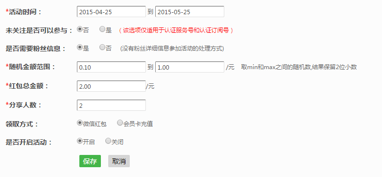 未關(guān)注是否可以參與,是否需要粉絲信息:確保是否是服務(wù)號,如果不是要關(guān)閉是否關(guān)注和是否需要粉絲信息驗(yàn)證。因?yàn)槿绻皇欠?wù)號,沒有獲取粉絲信息權(quán)限,所以對非服務(wù)號這個(gè)設(shè)置不起作用
