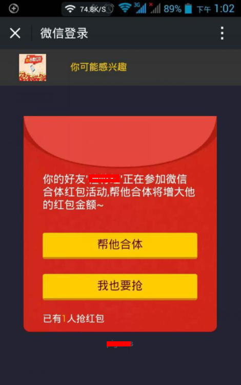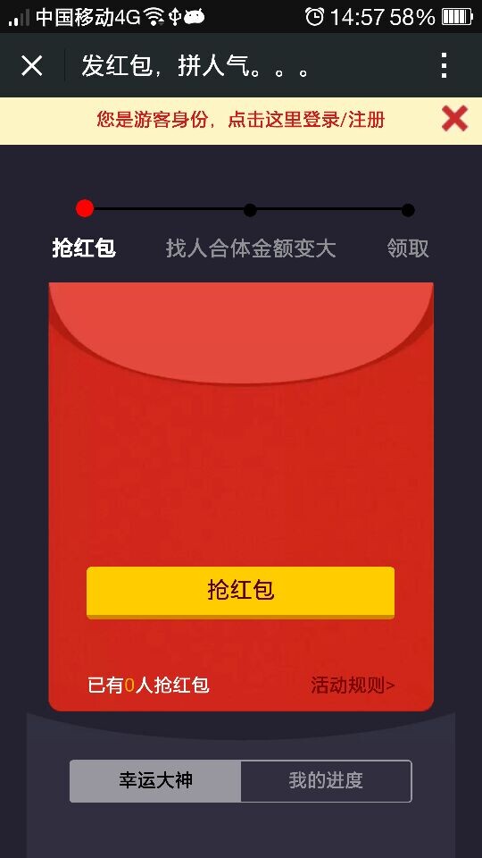 點(diǎn)擊“幫他合體”,對方的紅包就會變大;點(diǎn)擊“我也要搶”進(jìn)入搶紅包界面,分享次數(shù)達(dá)到商家設(shè)定的次數(shù)后就可以就可以領(lǐng)取紅包。